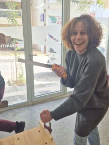 Μετά τις μετρήσεις και με τη βοήθεια σφιγκτήρα και πριονιού ξεκινήσαμε να κόβουμε …μανιωδώς τα ξύλα για να φτιάξουμε τα γράμματά μας. Δύσκολο μεν, πολύ εκτονωτικό και διασκεδαστικό δε!!