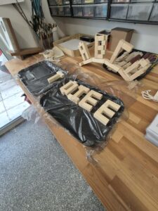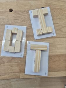 Αφού φτιάξαμε τα γράμματα στα πάνελ, έπρεπε μετά να τα κατασκευάσουμε με ξύλο. Στην αρχή πήραμε κάρτες με τα γράμματα που ήταν σχηματισμένα με κύβους και ορθογώνια παραλληλεπίπεδα. Εμείς έπρεπε να ψάξουμε σε κάθε γωνιά του εργαστηρίου για να βρούμε τους ξύλινους “οδηγούς” που θα μας βοηθούσαν να κόψουμε τα κομμάτια ξύλου για να φτιάξουμε τα δικά μας γράμματα.