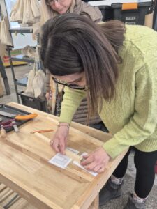 Αφού φτιάξαμε τα γράμματα στα πάνελ, έπρεπε μετά να τα κατασκευάσουμε με ξύλο. Στην αρχή πήραμε κάρτες με τα γράμματα που ήταν σχηματισμένα με κύβους και ορθογώνια παραλληλεπίπεδα. Εμείς έπρεπε να ψάξουμε σε κάθε γωνιά του εργαστηρίου για να βρούμε τους ξύλινους “οδηγούς” που θα μας βοηθούσαν να κόψουμε τα κομμάτια ξύλου για να φτιάξουμε τα δικά μας γράμματα.