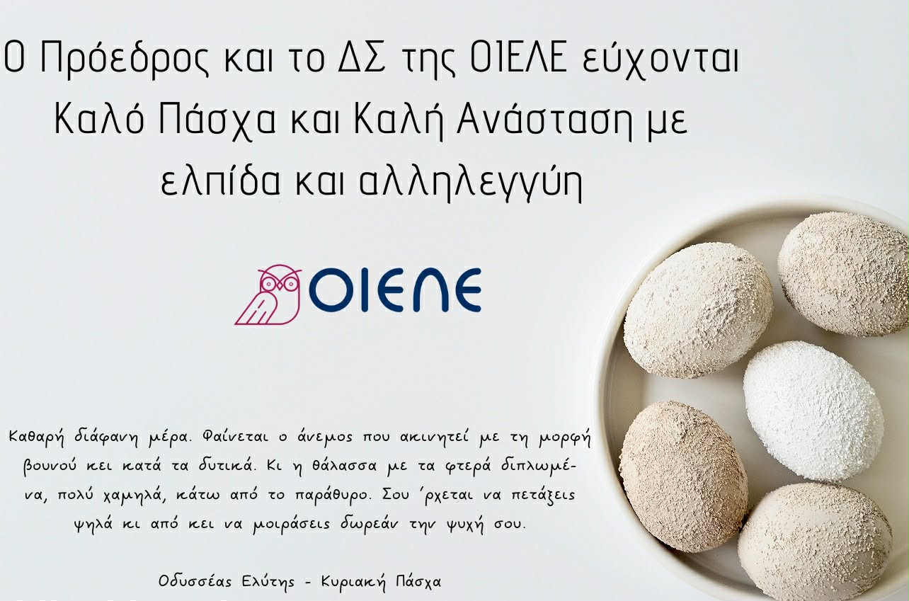 Ο Πρόεδρος και το ΔΣ της ΟΙΕΛΕ εύχονται σε συναδέλφους, γονείς, μαθητές και σε κάθε πολίτη Καλό Πάσχα και Καλή Ανάσταση.