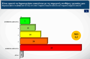 • Η συνολική ικανοποίηση από την εργασία κυμαίνεται στο 35%, ενώ άγχος – στρες δηλώνει ότι αντιμετωπίζει το 53%.
