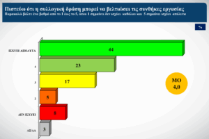 • Το 36% έχει συμμετάσχει σε απεργία ή άλλη συλλογική κινητοποίηση και το 67% δηλώνει ότι θα συμμετείχε σε απεργία αν θεωρούσε δίκαιο το αίτημα, ενώ ένα ίδιο υψηλό ποσοστό θεωρεί ότι η συλλογική δράση μπορεί να βελτιώσει τις συνθήκες εργασίας.