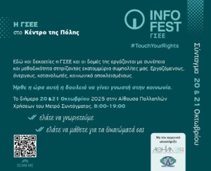 Η ΓΣΕΕ φέρνει την ενημέρωση για τα εργασιακά και κοινωνικά δικαιώματα στον πιο πολυσύχναστο κόμβο της Αθήνας, με το INFO FEST 2025, μια διήμερη δράση που θα πραγματοποιηθεί στις 20 και 21 Οκτωβρίου, από τις 08:00 το πρωί έως τις 19:00 το απόγευμα στην Αίθουσα Πολλαπλών Χρήσεων του Μετρό Συντάγματος.