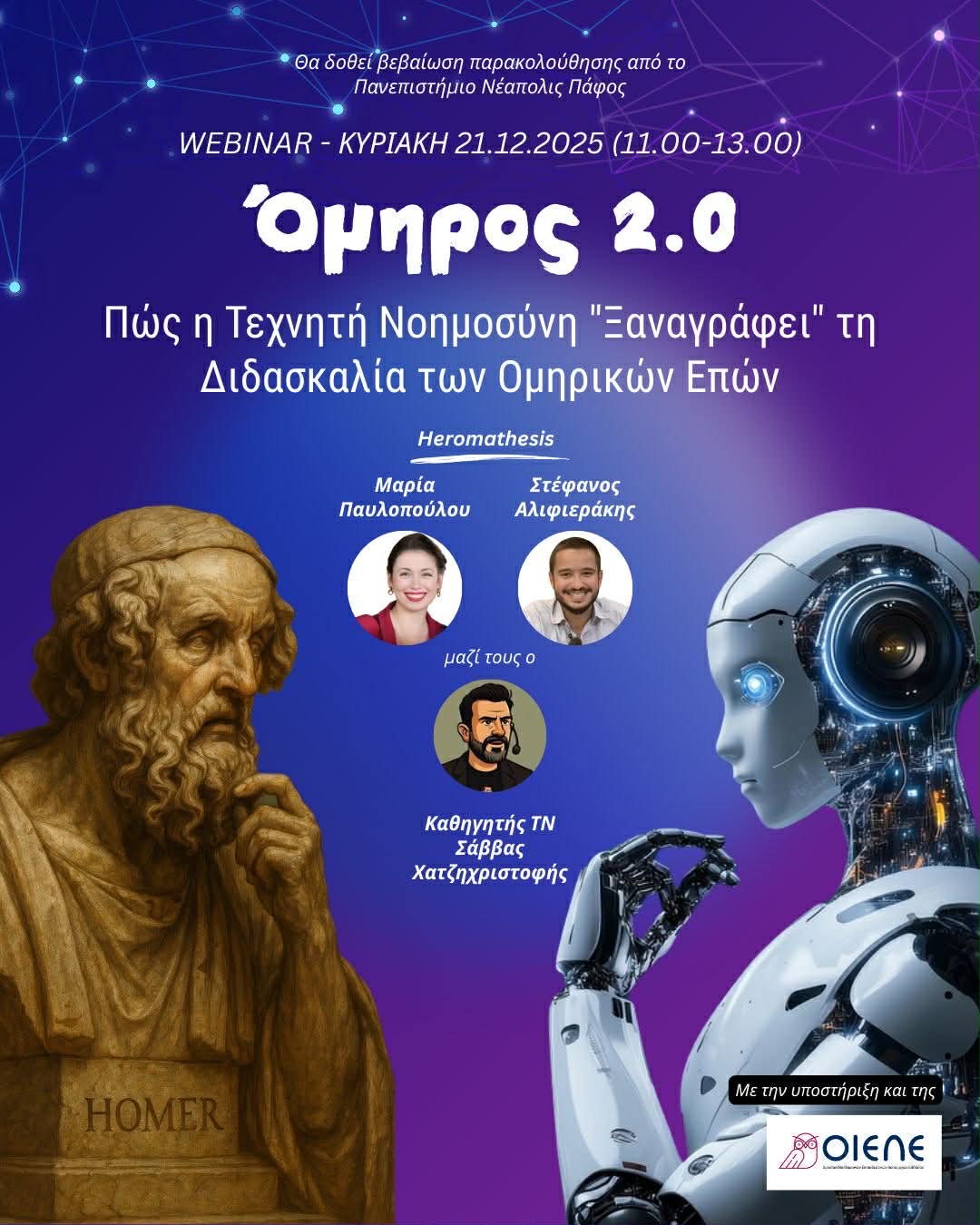 Κυριακή, 21/12, στις 11 π.μ., στο κατώφλι των εορτών. Κάντε ένα δωρεάν εκπαιδευτικό δώρο στον εαυτό σας, παρακολουθώντας το webinar της ομάδας heromathesis με το Πανεπιστήμιο Πάφου. Θέμα, η διδασκαλία των ομηρικών επών με την βοήθεια της τεχνητής νοημοσύνης και τίτλος, «Όμηρος 2.0»! Το webinar υποστηρίζει η ΟΙΕΛΕ που στέκεται στο πλάι εκπαιδευτικών δημιουργών που έχουν κάτι καινούριο, ενδιαφέρον και καινοτόμο να προτείνουν.