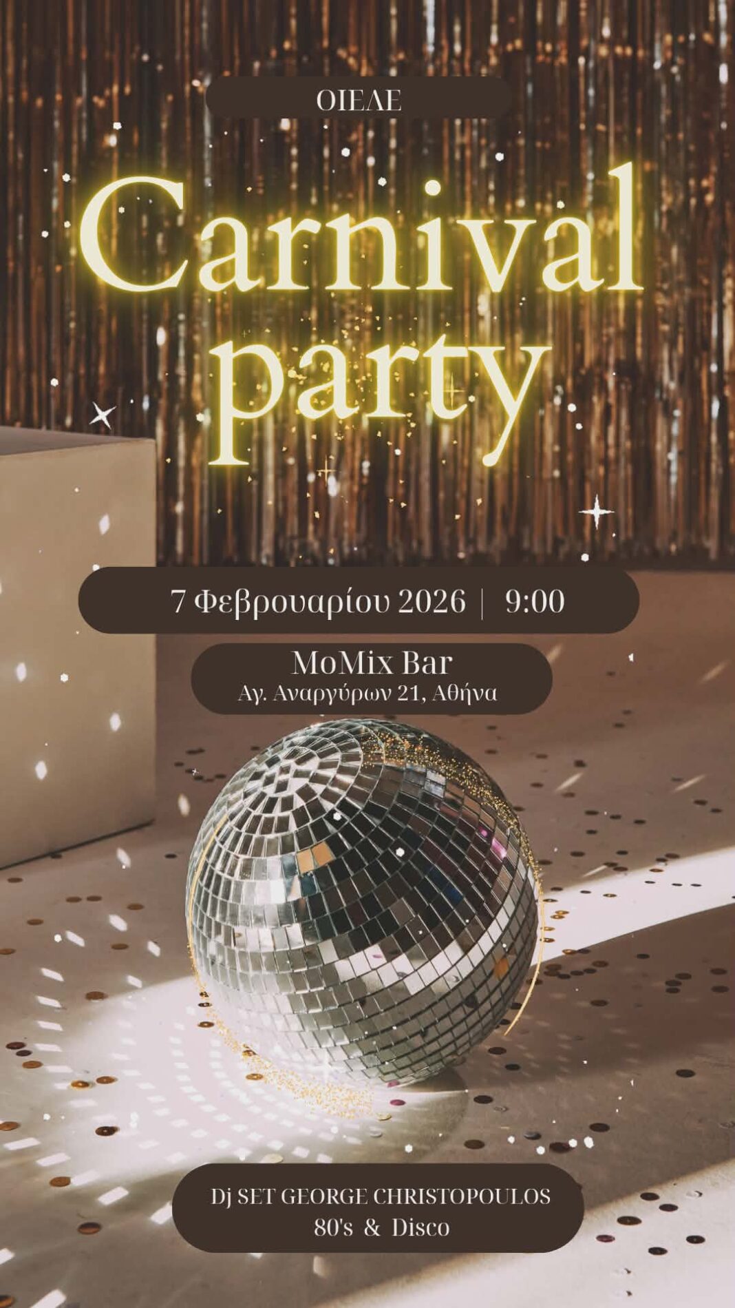 Για δεύτερη συνεχόμενη χρονιά, μετά την περσινή επιτυχημένη εκδήλωση, αποφασίσαμε (η ΟΙΕΛΕ και ο ΣΙΕΛ) να διοργανώσουμε ένα αποκριάτικο πάρτι για όλες και όλους τους συναδέλφους το Σάββατο, 7 Φεβρουαρίου στο εντυπωσιακό Momix Bar (Αγ. Αναργύρων 21, Ψυρρή). Έναρξη του πάρτι, 21:30.