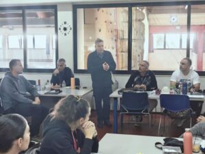 Συνοδευόμενος από τους εκπαιδευτικούς του σχολείου (που είναι και μέλη στο ΔΣ της Ομοσπονδίας) Δημήτρη Κατσορίδα και Φώτη Καραμεσίνη, έκανε ξεχωριστές ενημερώσεις στους εκπαιδευτικούς του Δημοτικού, του Γυμνασίου, του Λυκείου, σε εκπαιδευτικούς ειδικοτήτων και είχε συναντήσεις με τα στελέχη του σχολείου και τον ιδιοκτήτη κ. Λ. Γείτονα.